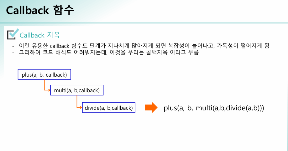 // 콜백 사용시 콜백지옥 발생(2단계 이사상 진행시...)